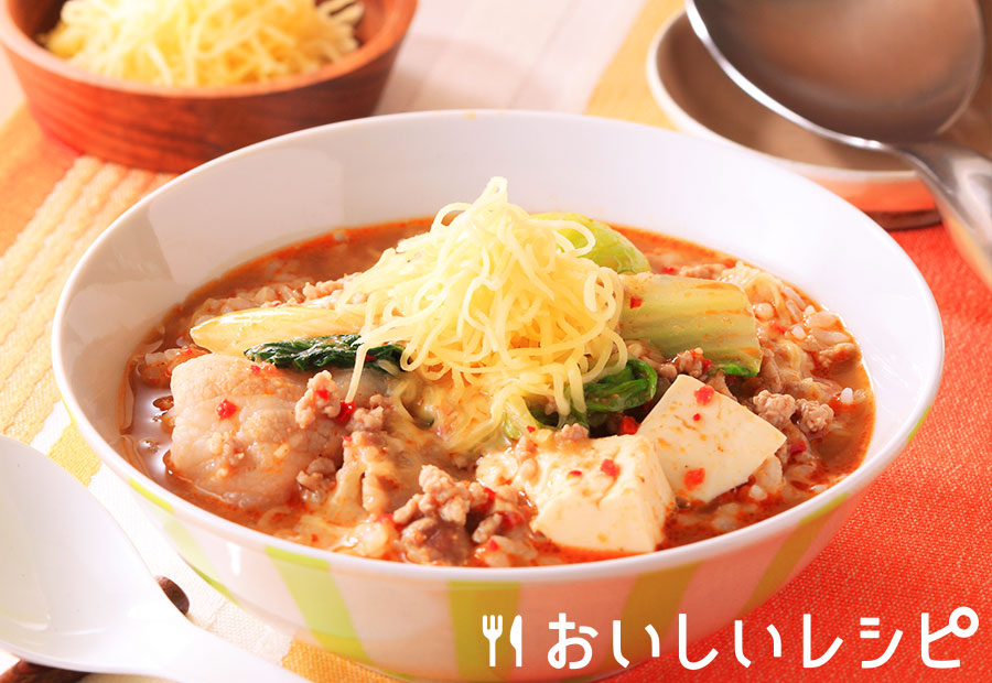 - こってり担々ごまライス担々ごま鍋の〆にチーズをトッピング。チーズとピリ辛ごま味がよく合います!