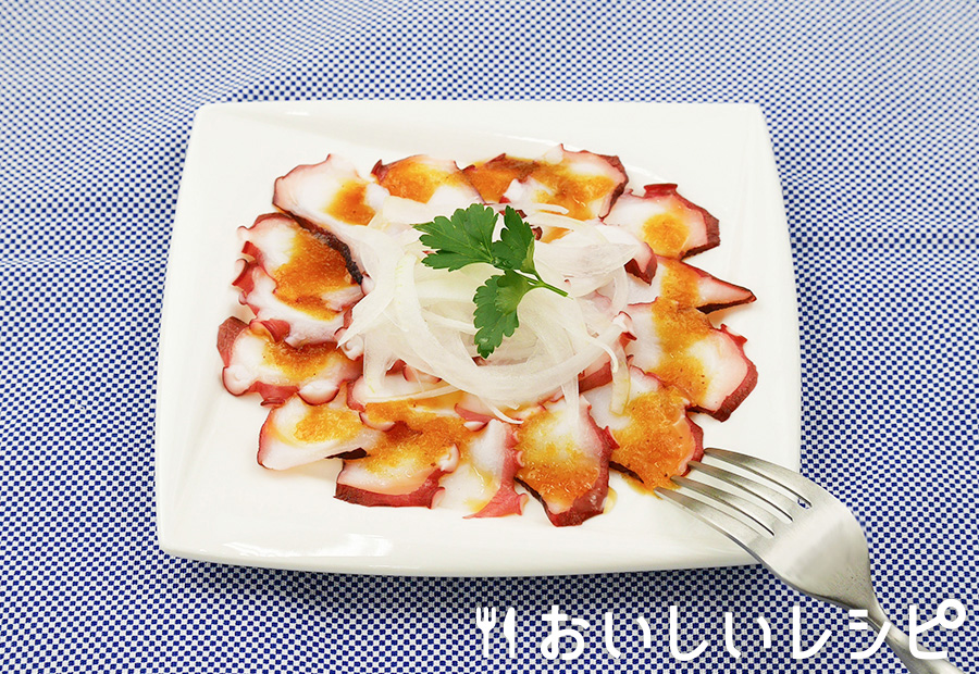 - たことイカのおろしカルパッチョ「おろしのたれ」にピクルスを加えて洋風に! 甘酸っぱくて後味さっぱり。シャキシャキたまねぎとどうぞ!