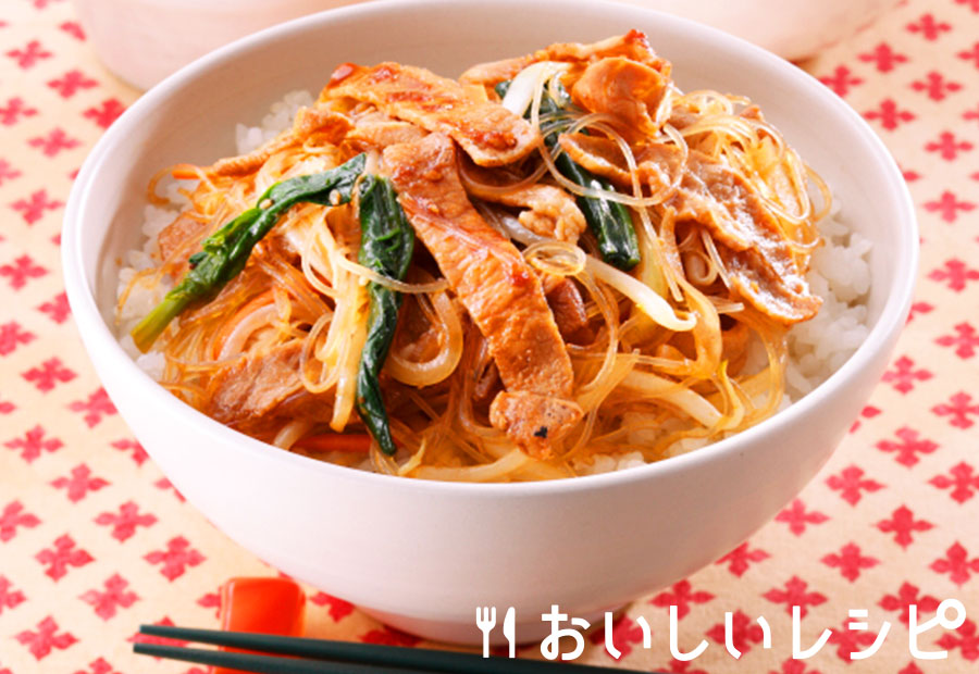 - チャプチェ風豚焼肉丼チャプチェの味付けも「焼肉のたれ」におまかせ! 野菜の甘みとコチュジャンの辛みで、ごはんがすすむ!