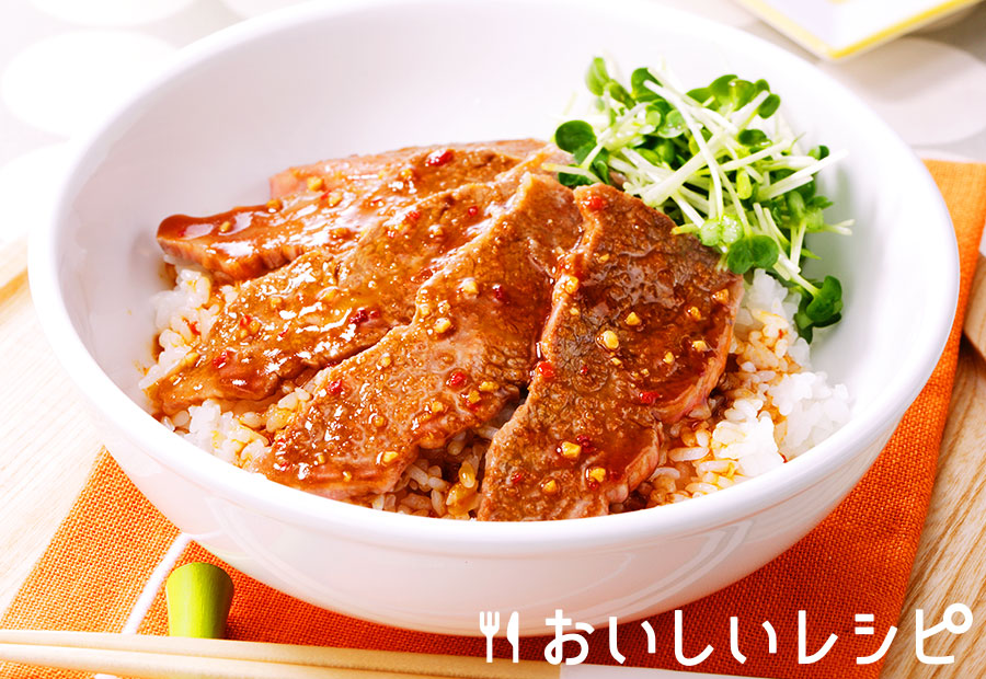 - にんにく風味の焼肉丼カルビ肉を焼いて、焙煎にんにく風味だれで味付けして、ごはんにのせて。タレがしみたごはんがウマイ!