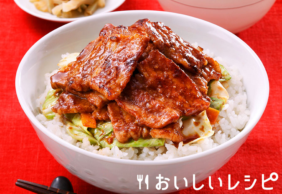 - チャプチェ風豚焼肉丼チャプチェの味付けも「焼肉のたれ」におまかせ! 野菜の甘みとコチュジャンの辛みで、ごはんがすすむ!