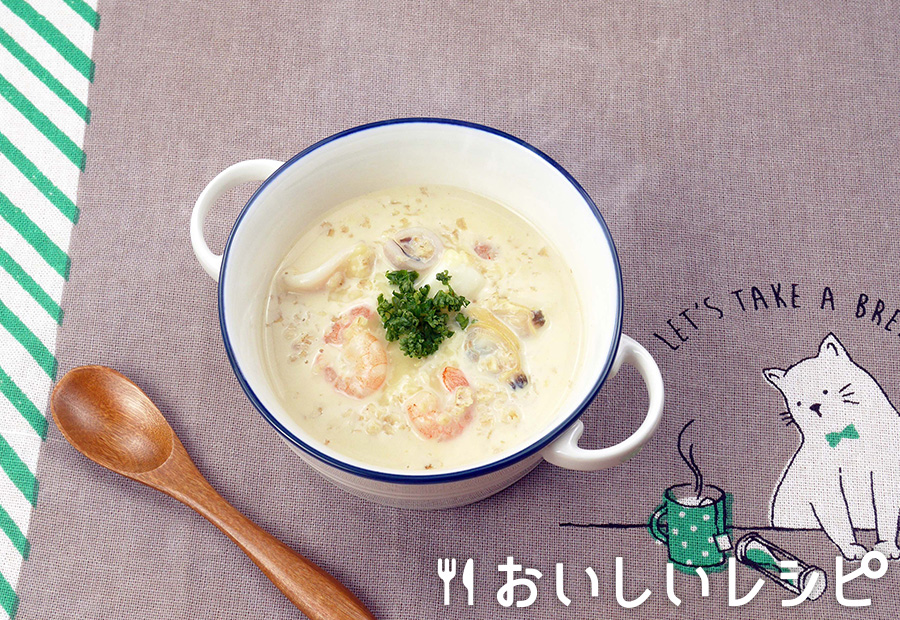 - オートミールでシーフードリゾット豆乳で煮込んで、とろりと濃厚な味わいに仕上げます。人気のオートミールを使ったリゾットです。