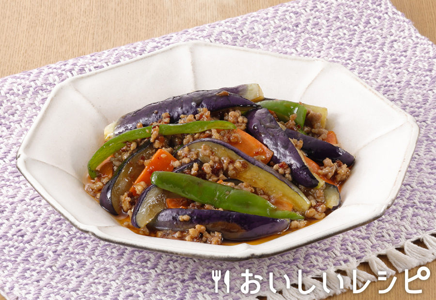 - プチッと彩り麻婆茄子麻婆茄子にピーマンとにんじんを加えて、彩りよく! お好みでたまねぎやきのこにアレンジするのも◎