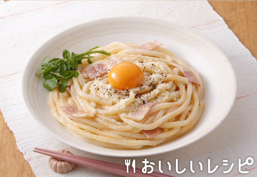 - たらこカルボナーラうどんたらこクリームうどんをカルボナーラ風にアレンジ! 卵黄をからめて召しあがれ!