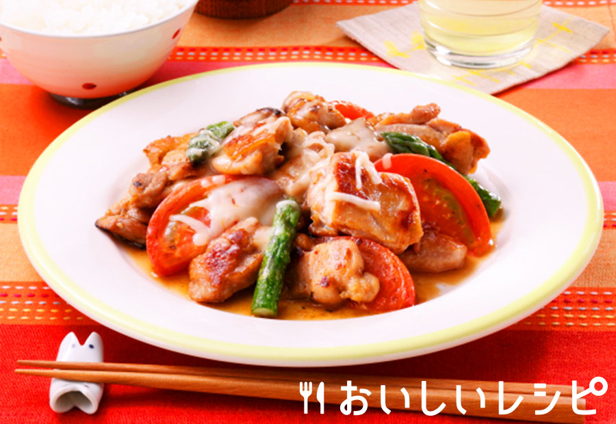 - うまトマチキン焼肉定食トマトと醤油の相性◎ アスパラガスのシャキシャキ食感と、とろ~りチーズの組み合わせがgood!