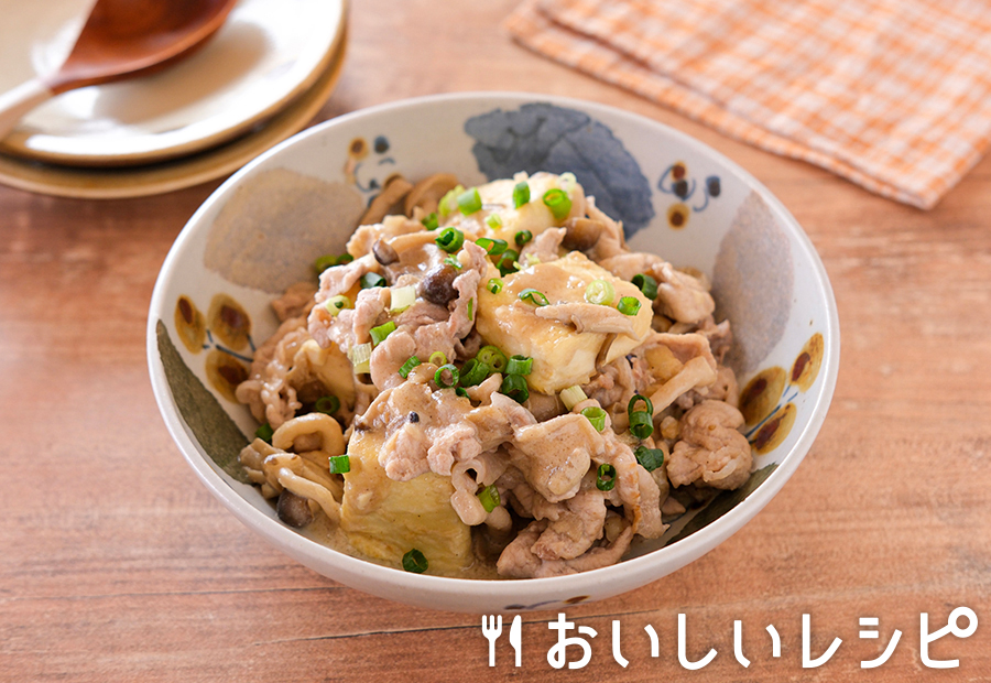 - 豚肉と豆腐ときのこの豆乳ごま炒め