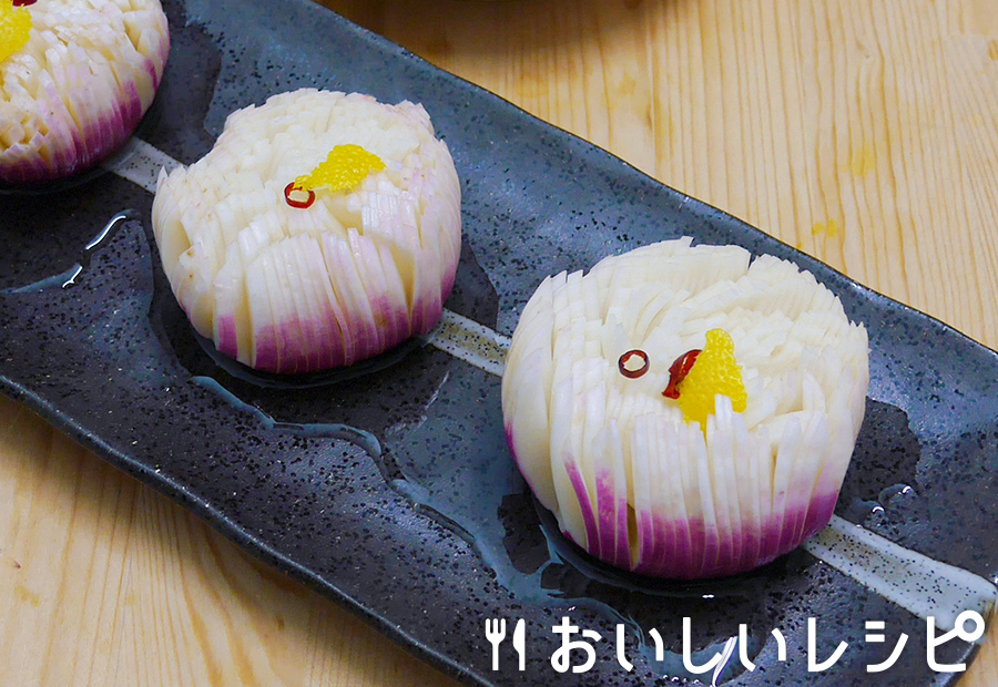 紫と白のコントラストがキレイな「あやめ雪かぶ」を使った甘酢漬け。ちょっとしたおもてなしにも最適です。