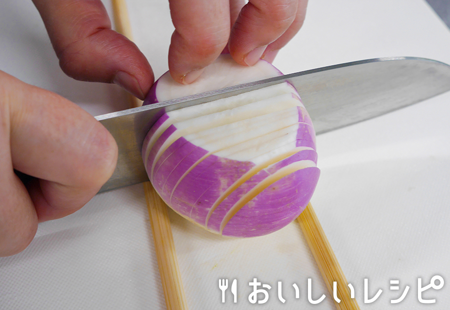 かぶは天地を切り、茎の面を下にして、下まで切り落とさないよう両端に菜箸を置き、格子状に細かく切り込みを入れます。(1)をポリエチレン袋に入れて「浅漬けの素プチスタイル」を注ぎ、空気を抜いて軽くもんでから、冷蔵庫で約30分漬けます。(時間外) 汁気をきって皿に盛り、出来あがりです。 ※お好みで赤唐辛子やゆずの皮を一緒に漬けると風味がよくなります。
