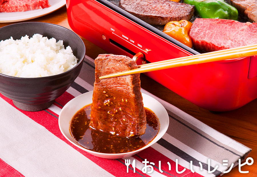 - ホットプレートで肉や野菜を焼き、「黄金の味」につけてお召しあがりください。