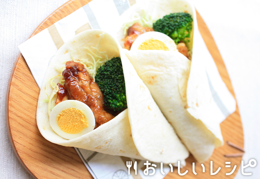 「黄金の味」で味付けしたジューシーな鶏肉と、千切りキャベツを一緒に巻いた、てりやきトルティーヤ。
