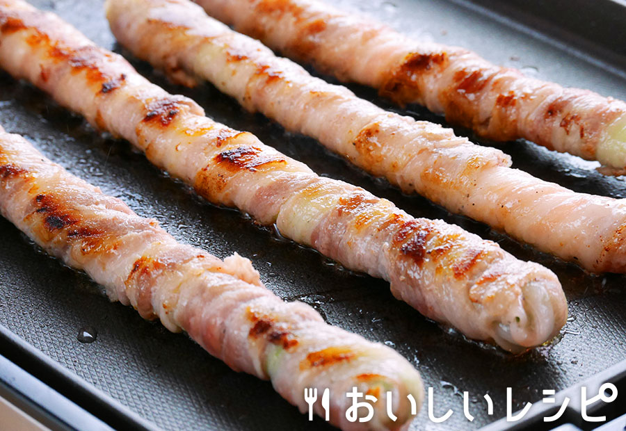 - 長ねぎに(1)の肉をきつく巻きつけます。両端の部分は、肉を折りこむようにして長ねぎが見えないようにします。