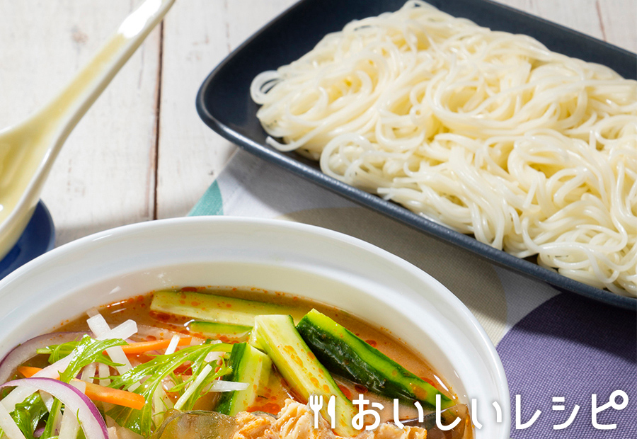- [〆のそうめん]耐熱容器にそうめんを入れ、熱湯を注ぎ、菜箸でほぐしながら約30秒かき混ぜます。