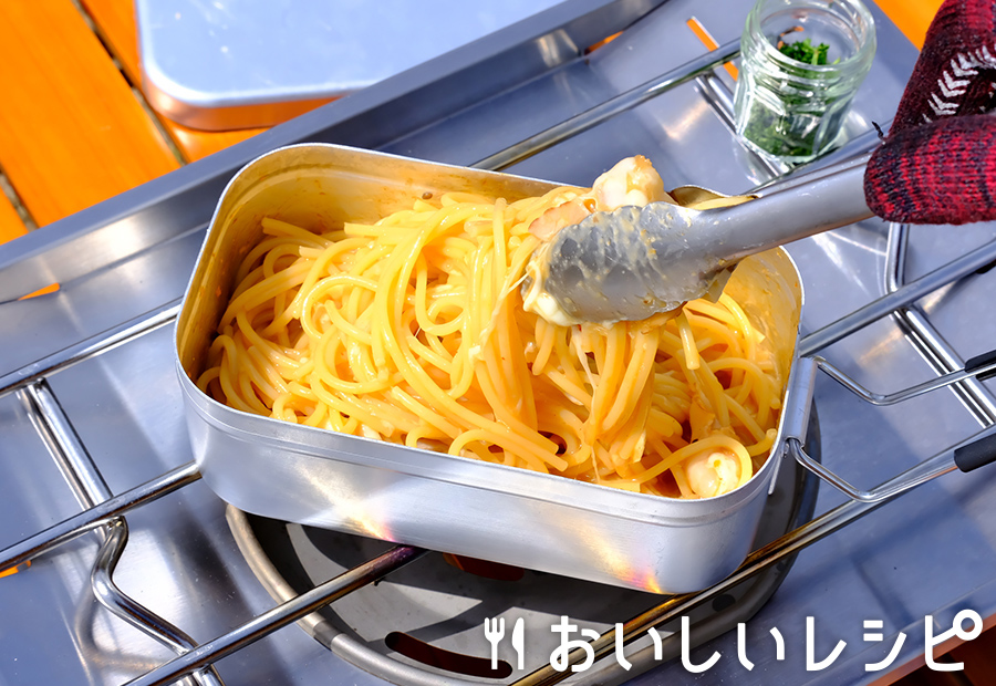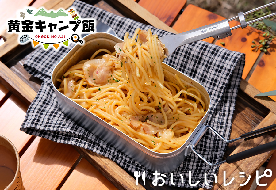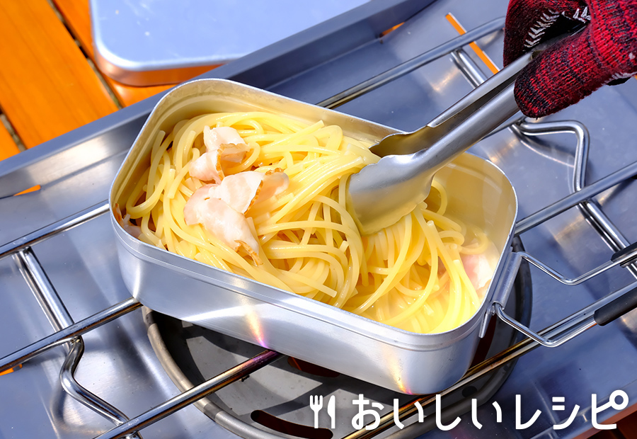 メスティンで作る、湯きり不要の簡単パスタ! 味付けは「黄金の味」におまかせ!