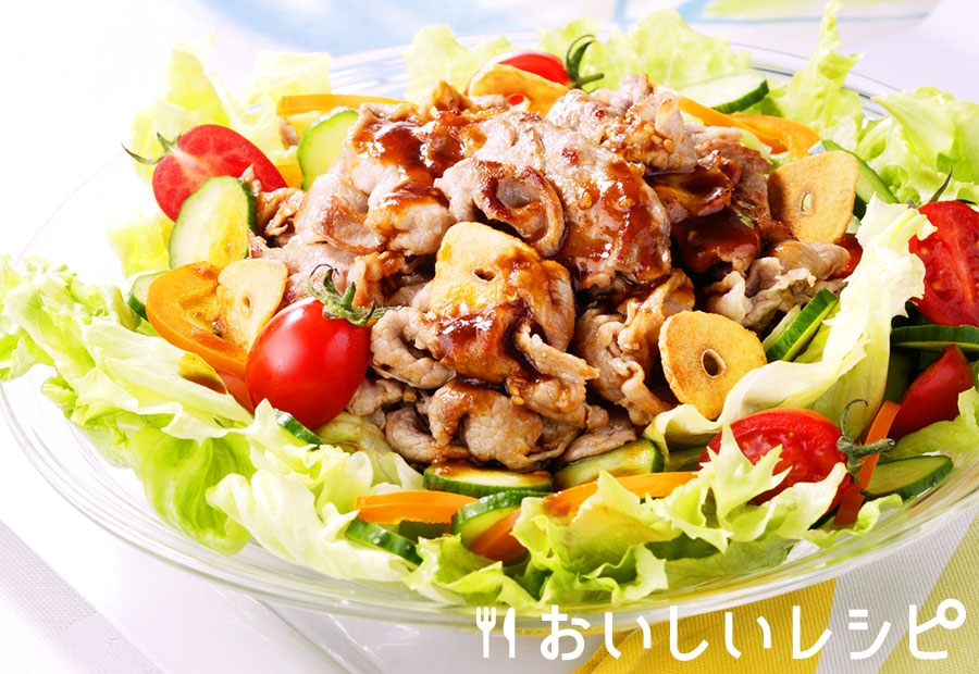 豚薄切り肉 200~250g レタス 1/4個 きゅうり 1本 パプリカ 1/2個 ミニトマト 適量 エバラ黄金の味 適量 サラダ油 適量 ガーリックチップ 適宜