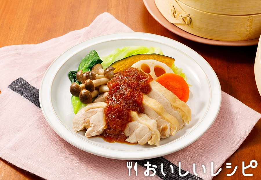 ふっくらジューシーな蒸し鶏に、季節の彩り野菜を添えて。具材がのっかる「おろしのたれ」で召しあがれ!