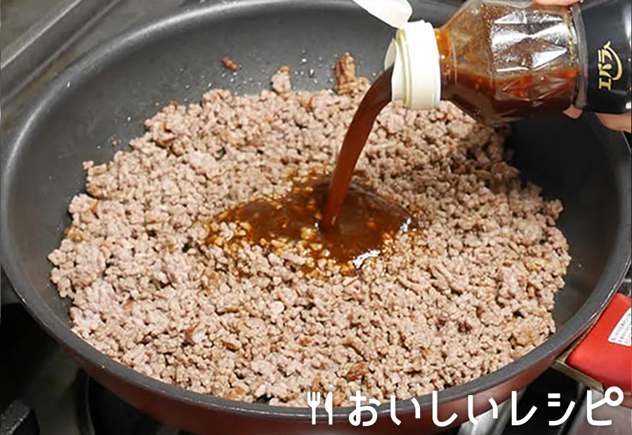 フライパンを熱し、挽き肉を炒め、「黄金の味」で味付けします。(お好みでチリパウダーを加えてください)