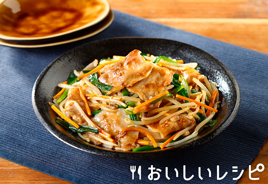 - フライパンに油を熱し、豚肉を炒め、もやし・にんじん・ニラの順に加えて炒め合わせます。