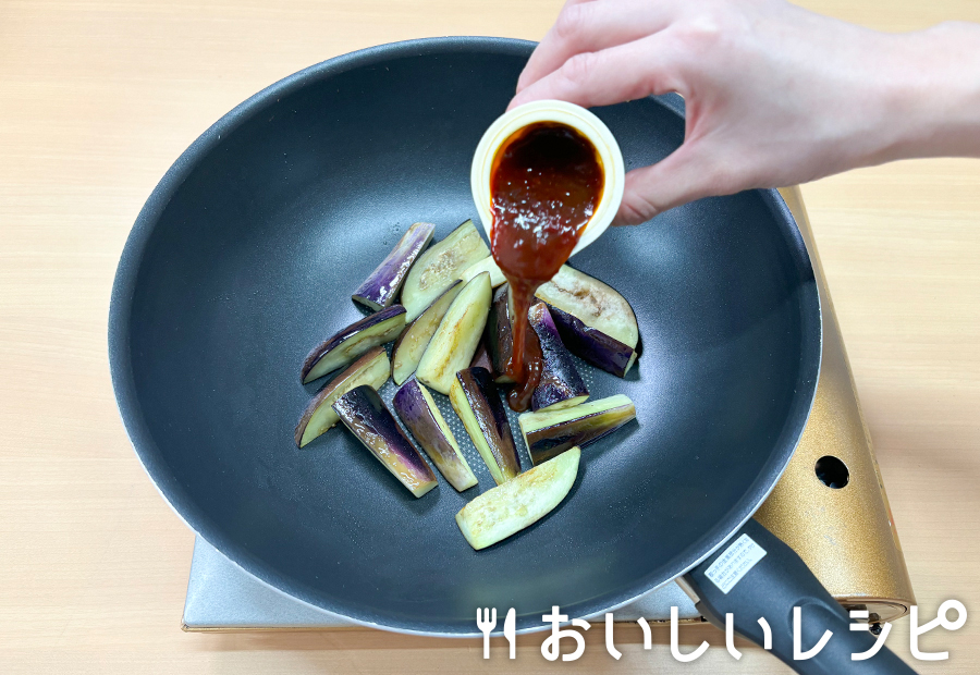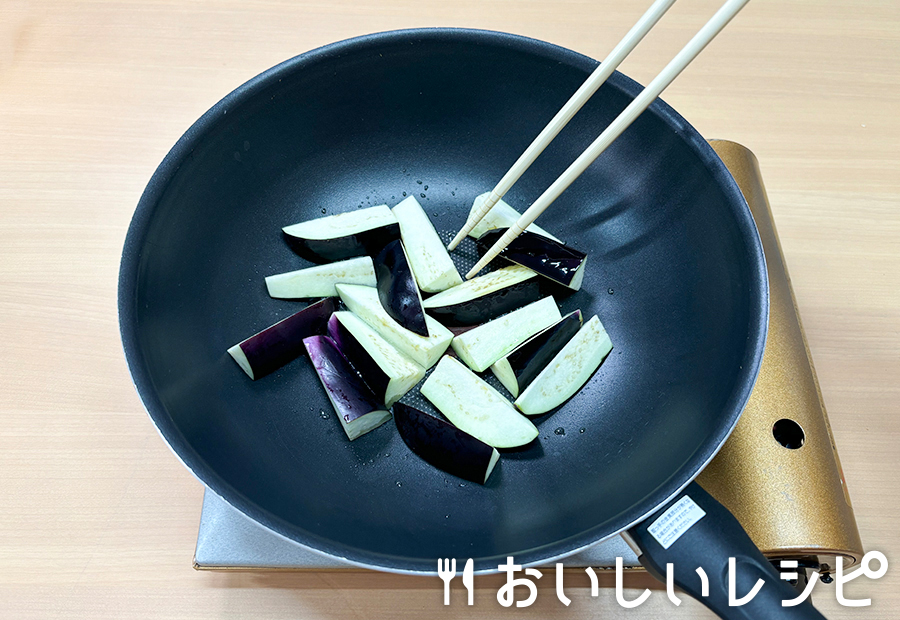 2. フライパンに油を熱し、中火でなすを炒めます。