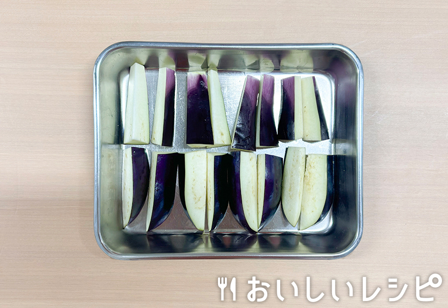 1. なすは長さを半分に切ってから縦4つ切りにします。