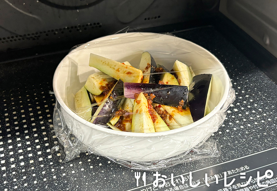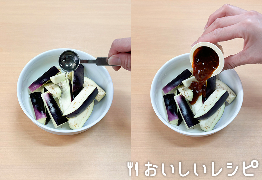 2. 深めの耐熱容器になすを入れ、油をふりかけ、「プチッと中華」を回しかけます。