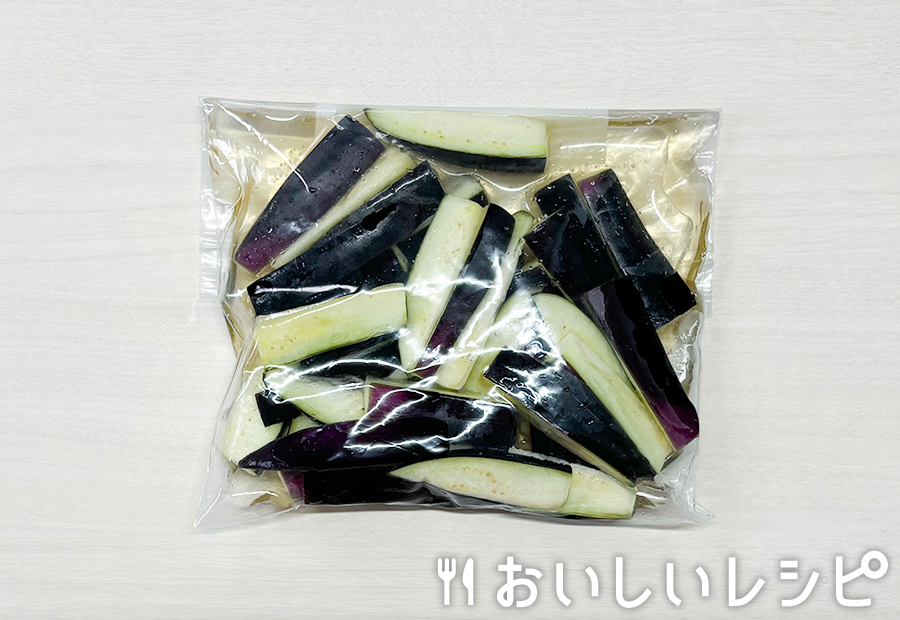 なすは食べやすい大きさに切り、水にさらします。 (1)をポリエチレン袋に入れて「浅漬けの素」を注ぎ、空気を抜いてよくもんでから、冷凍庫で約1時間漬けます。(時間外)