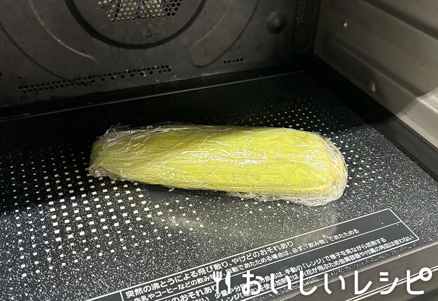 とうもろこしは薄皮を1~2枚残して皮をむき、水洗いしてラップで包み、電子レンジ(600W)で約4分加熱し、粗熱がとれるまでラップをしたまま約15分おきます。(時間外)
