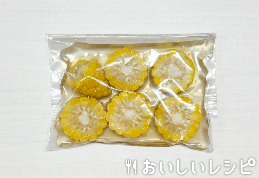 とうもろこしの皮をむき、食べやすい大きさに切ります。 (2)をポリエチレン袋に入れて「浅漬けの素」を注ぎ、空気を抜いて軽くもんでから、冷凍庫で約1時間漬けます。(時間外)
