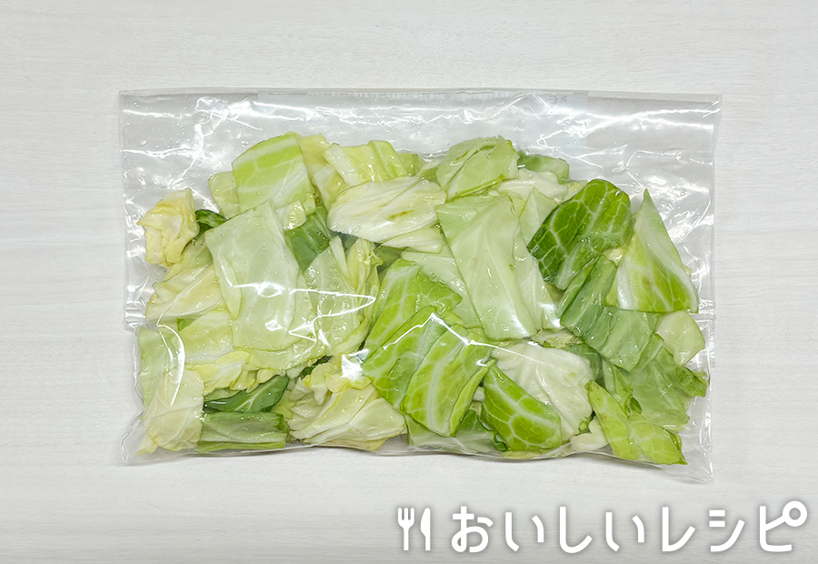 キャベツはざく切りにします。 (1)をポリエチレン袋に入れて「浅漬けの素」を注ぎ、空気を抜いて軽くもんでから、冷凍庫で約1時間漬けます。(時間外)