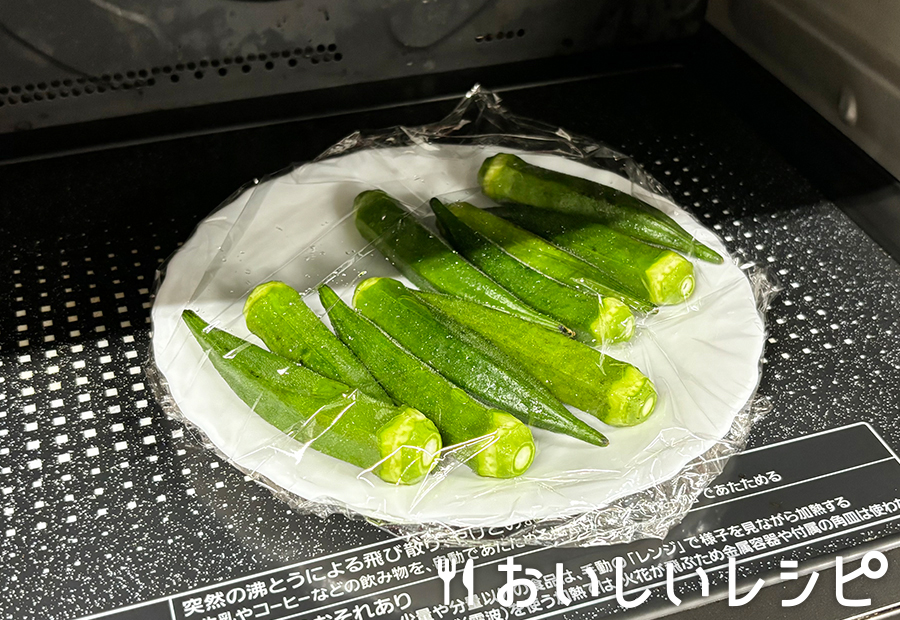 オクラは板ずりしてガクを取り除き、水洗いして耐熱皿に並べ、ふんわりとラップをかけて電子レンジ(600W)で約2分加熱します。