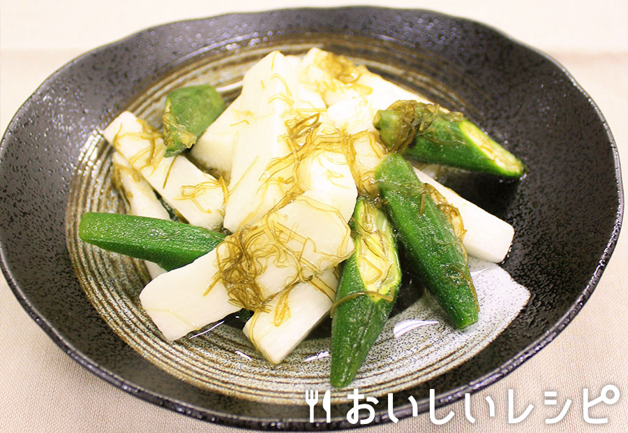 - 長芋は長さ3~4cm、幅1cmのスティック状に、オクラは板ずりして熱湯でさっとゆで、斜め半分に切ります。